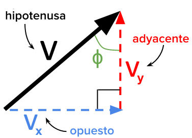 Cuando descomponemos cualquier vector diagonal en dos componentes perpendiculares, el vector total y sus componentes —v, comma, v, start subscript, y, end subscript, comma, v, start subscript, x, end subscript— forman un triángulo rectángulo. Debido a esto, podemos aplicarle las mismas reglas trigonométricas a la magnitud de un vector de velocidad y a sus componentes, como se puede ver a continuación. Ten en cuenta que se trata a v, start subscript, x, end subscript como el lado adyacente, a v, start subscript, y, end subscript como el opuesto y a v como la hipotenusa.