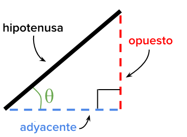 Antes de que hablemos acerca de descomponer vectores, debemos observar que la trigonometría ya nos da la habilidad de relacionar las longitudes de los lados de un triángulo rectángulo —hipotenusa, cateto opuesto y cateto adyacente— y uno de sus ángulos, theta, como se muestra a continuación.